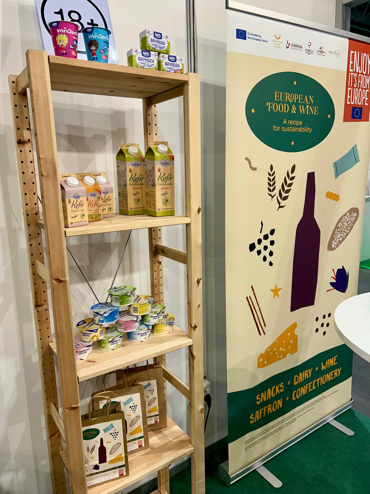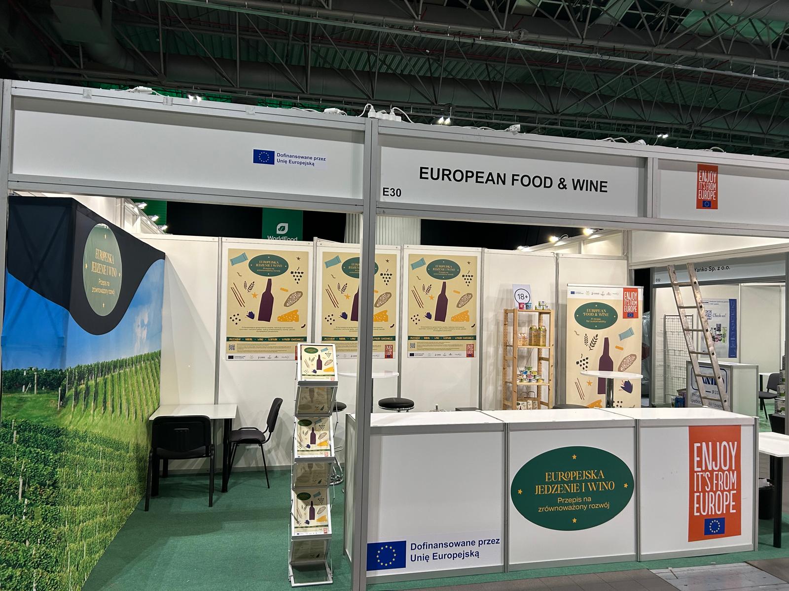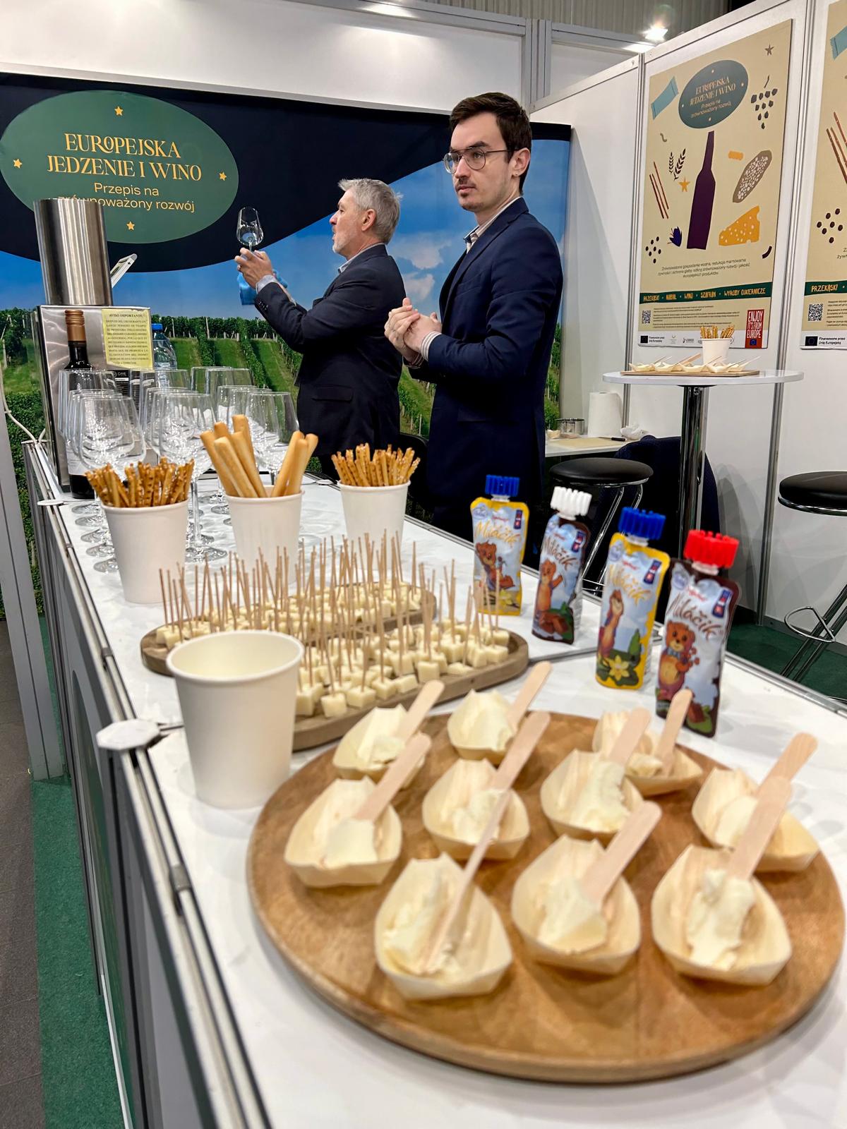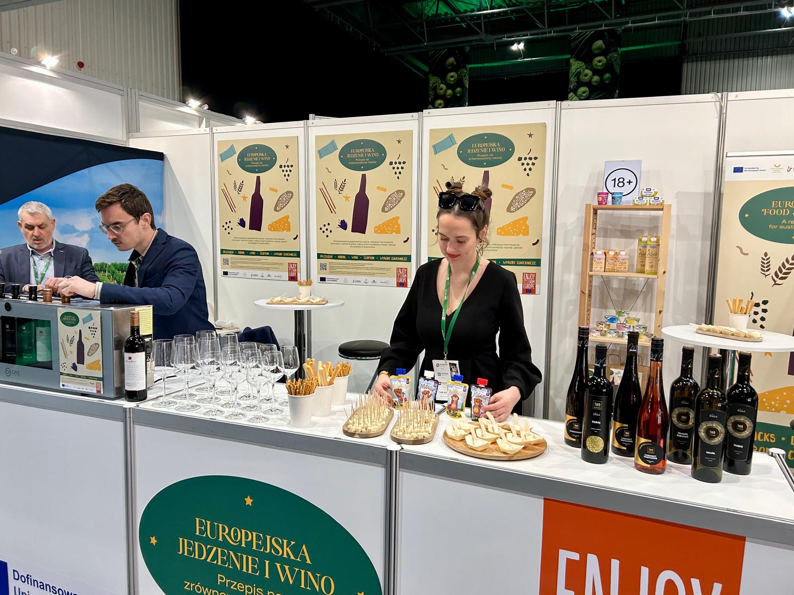 Nasza obecność koncentrowała się na w pełni oznakowanym stoisku programu, zaprojektowanym tak, aby przekaz był czytelny od pierwszego spojrzenia i angażujący w bezpośredniej rozmowie. Przestrzeń obejmowała m.in. brandowany fryz i lady, roll-upy i ulotki, ekran TV z materiałami programu oraz ekspozycję makiet produktów. Duża ściana z autentycznym zdjęciem winnicy dodawała realizmu i wzmacniała skojarzenie między zrównoważonym rozwojem, pochodzeniem i jakością. Przez cały czas trwania targów stoisko pełniło funkcję miejsca spotkań dla trzech kluczowych grup: młodych dorosłych, osób podejmujących decyzje zakupowe w gospodarstwach domowych oraz profesjonalistów z branży, w tym importerów, dystrybutorów i kupców.